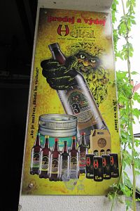 Otevírají ve 3 hodiny, takže nám to perfektně vychází. Vlastní pivovar je za budovou restaurace, ve dvoře je i venkovní posezení. Ota kupuje 5 piv a já sobě višňovou limonádu. K tomu získává etikety a tácek. Rozšiřuje se tedy svoji sbírku. Kdyby to vždy tak snadno vycházelo byl by snad nejspokojenější člověk pod sluncem.