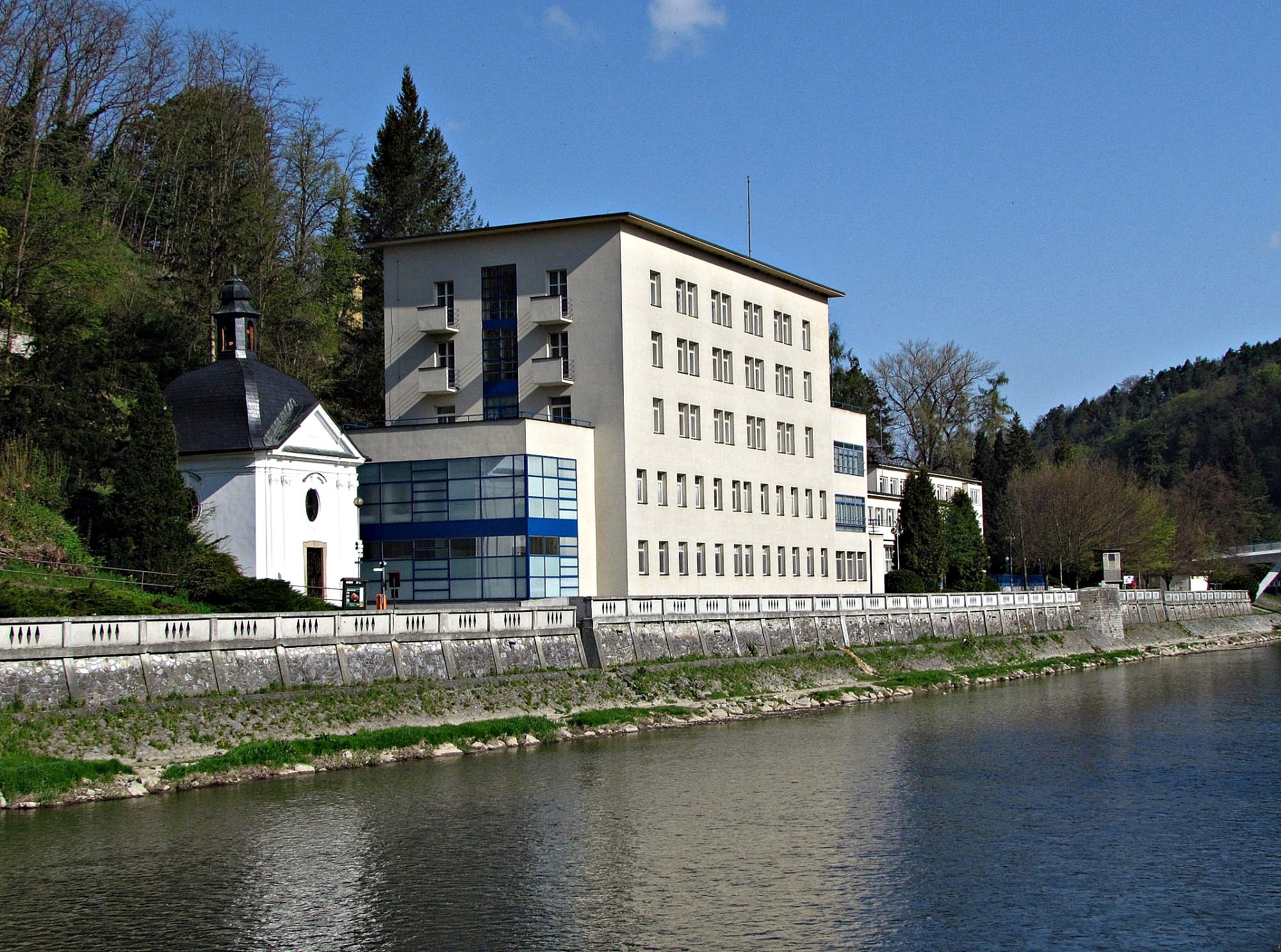 Ale vraťme se k vlastnímu areálu: roku 1924 byl hlavní objekt velkoryse přestavěn v duchu geometrické secese dle návrhu, jež dodal Josef Ernst.