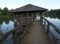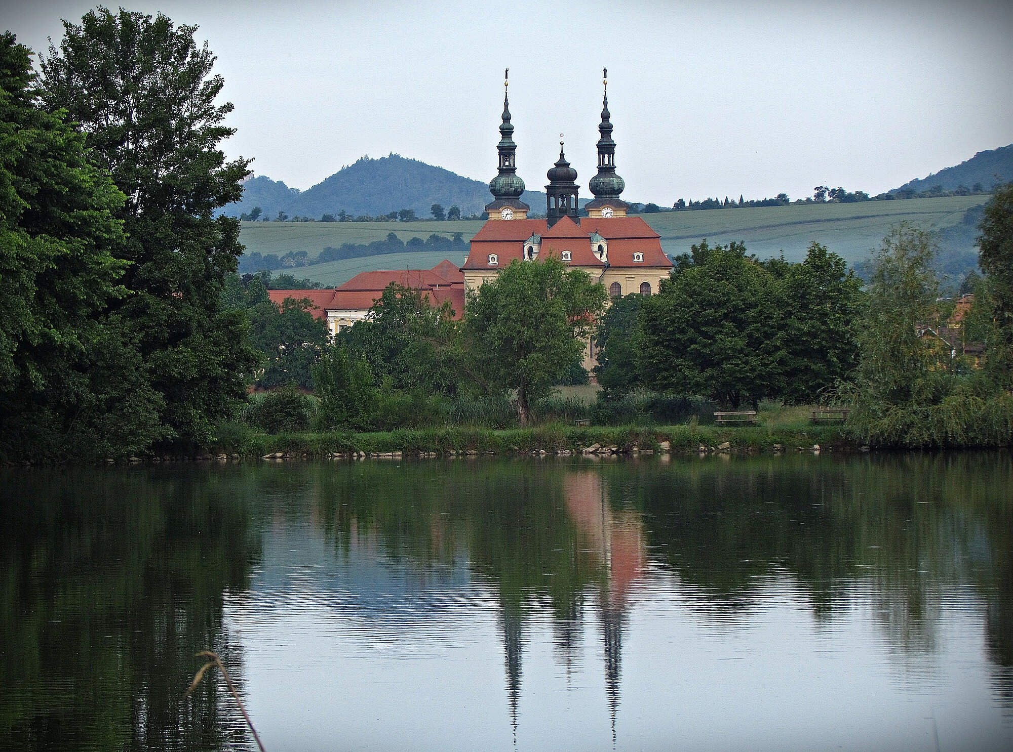 Pak už jsem stanul na hrázi Konventního rybníka, který je se svým opodál ležícím kolegou Žabincem sice vodní nádrží novodobou, ale v podstatě znovuzbudovanou. Obě se staly vítaným oživením ploché části doliny mezi Velehradem a obcí Modrá. Od známého Archeoskanzenu Modrá okolo nich vede k Velehradu modře značená tur.trasa a cyklostezka. Na Konventním rybníku bylo zbudováno dřevěné molo s vyhlídkovým altánem, ale daleko hezčí výhled na areál Velehradu a typické chřibské dvouvrší s kaplí sv.Barbory a hradem Buchlovem se mezi oběma rybníky otevřel z trasy cyklostezky. Na ní jsem minul i několik kamenných sloupkovitých božích muk.