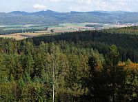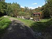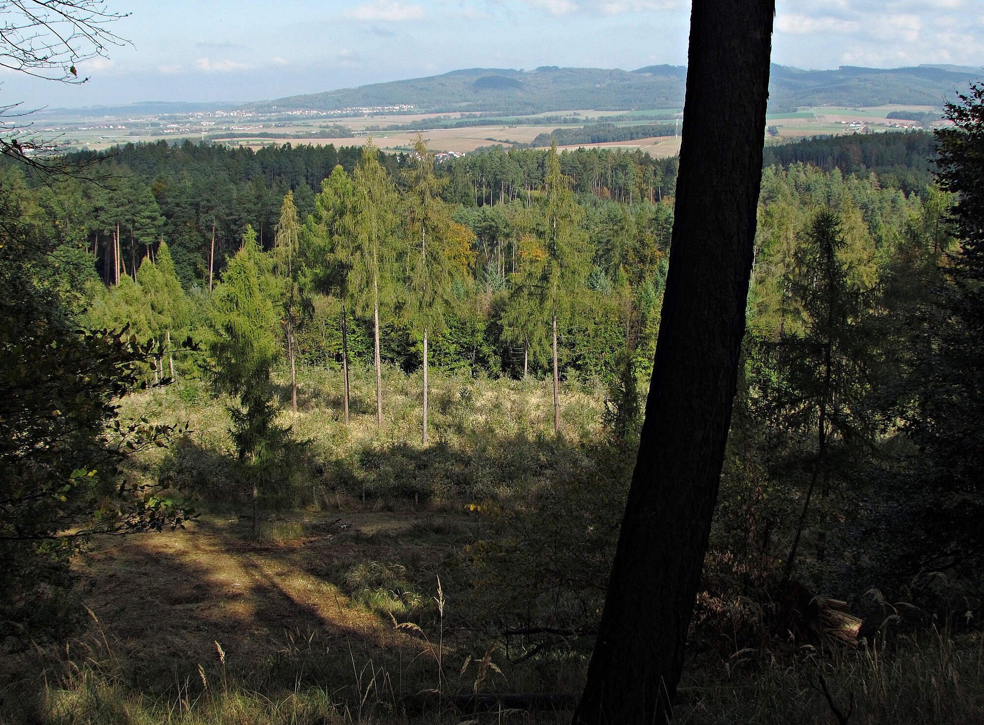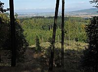 Nahoře jsem narazil na tábořiště s ohništěm obklopeným jednoduchými lavičkami. Vedle na stromě byl v zasklené budce umístěn text, z něhož jsem se dozvěděl, že zde byla ve třicátých letech minulého století pro potřeby zeměměřičů zbudována 25 m vysoká dřevěná rozhledna. V roce 1961 se bohužel nacházela už v tak špatném stavu, že musela být čtyřmi mládenci z Hostišové stržena.