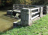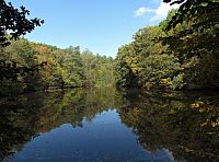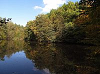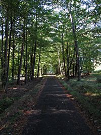 Z Hřebene seběhnuto dolů do zalesněného údolí, kterým k níže položeným Zboženským rybníkům klesala zpevněná cesta, doprovázená žlutě značenou tur.trasou. Nejprve jsem minul novodobější Zadní rybník a o kus níž dorazil k trojici klasických zboženských vodních nádrží. Tady jsem se – poučen mapami.cz, vydal vyhledat místo zaniklé středověké osady.