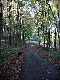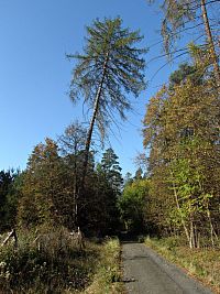 Protože už nejsem zrovna nejmladší, zkrátil jsem si cestu ke Skále popojetím busem do obce Racková, na její horní zastávku jménem „Drahy.“ Odtud to k ní bylo jen asi 3 km. Nejprve jsem musel po silnici vystoupat zpět na horní konec dědiny pod les a odtud už k cíli pokračoval lesní asfaltkou. Ze začátku silnička chvílemi ještě nechutně stoupala, pak se ale vyhoupla na hřeben a odtud už pokračovala skoro stále po vrstevnici. Trošku mne zklamal pohled na okolní les a zarostlé paseky. Dnes totiž bylo už 12.října, ale listy stromů a keřů se dosud drze bránily svému klasickému podzimnímu přebarvení, a těch s pestře vymalovaným ohozem spatřeno jen pár. Cestou jsem potkal spoustu pěších i na kolech sedících výletníků a také dva houbaře, jejichž vrchovatě naplněné košíky v mé dušičce zažehly ohnisko závisti. Což u mne pak vyvolalo intenzivnější pátrání v lesním podrostu nad cestou, ale po několika zkusmých výbězích hore do hory, kdy nebylo zakopnuto ani o prašivku, bylo od zbytečného bláznění upuštěno a já se opět věnoval vlastní trase. Navíc už jsem se ocitl na poslední lesní křižovatce, odkud to bylo ke Skále jen několik minut chůze.