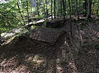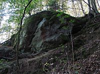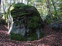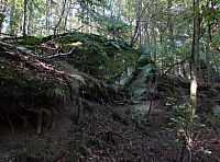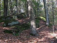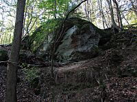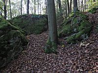 V okolí hlavního útvaru vystupovaly v listnatém lese ve svahu i na temeni vrchu další roztroušené shluky balvanů, ale ty už nebyly tak zajímavé. Při zpáteční chůzi k lesní křižovatce nad Hostišovou mne ještě zaujal nizoučký skalní amfiteátr hned nad cestou, jehož „výplň“ tvořil do země zapuštěný lesácký sklad, jehož střecha byla umně maskována popadaným listím.