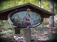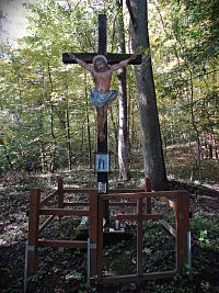 Mezi Středním a Horním zboženským rybníkem se musí po hrázi přejít na protější stranu a dál pokračovat lesní cestou vpravo. Ta je kvůli mokřině nad ní dosti blátivá, ale jak mi řekl můj kolega v práci (Mladcovják), sucho tu prý není nikdy. Po padesáti metrech chůze jsem dorazil k zastřešenému odpočívadlu s velkým svatým obrazem. Vedle stojí renovovaný dřevěný kříž s vymalovaným Ježíšem. Ve spodní části krucifixu je umístěna cedulka s textem, připomínající, že na tomto místě stával kostelík osady Zbožná, zaniklé v 16.století.
