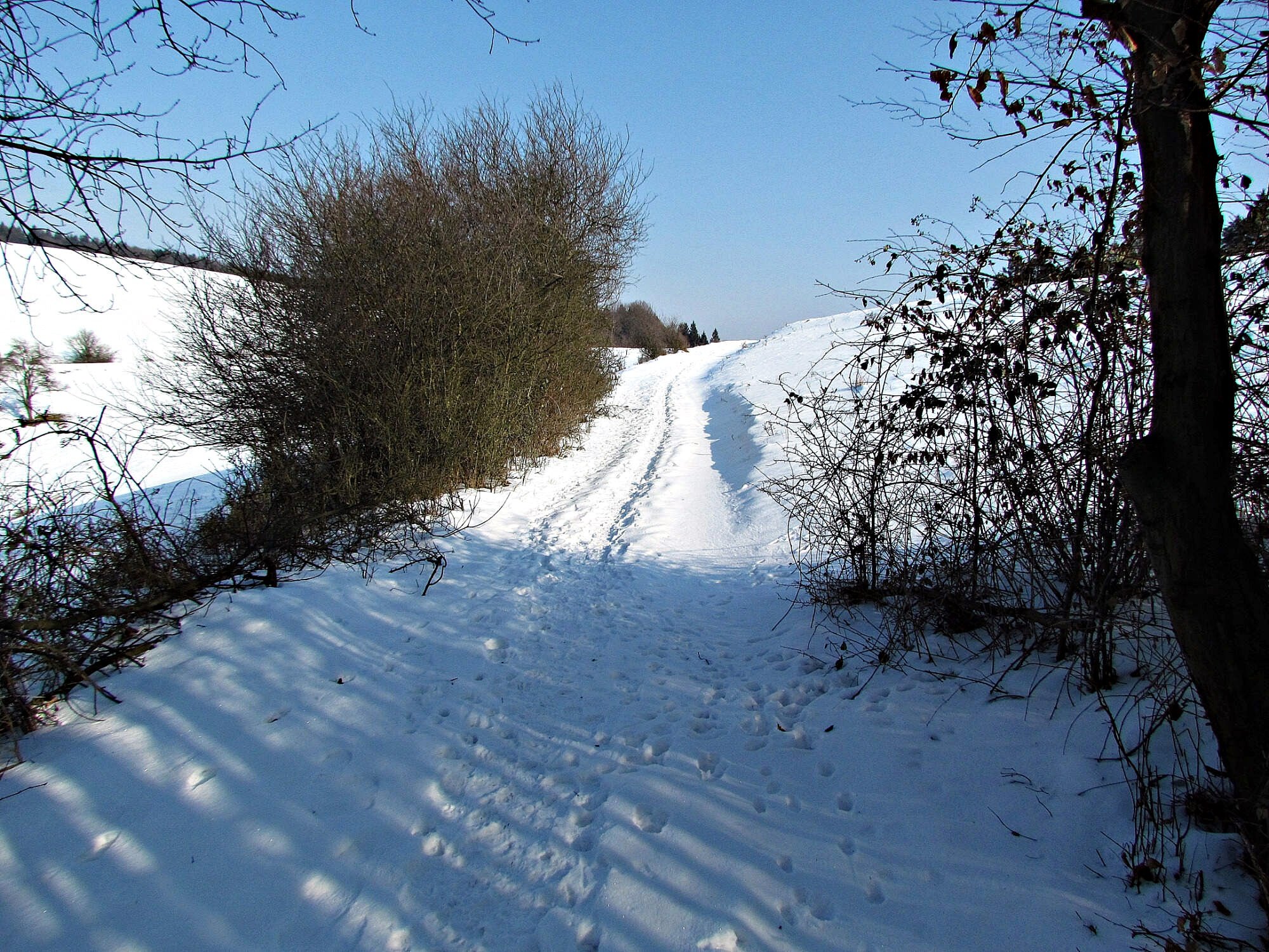 No, a pak už jsem mezi zástavbou vykročil po červené (směr Držková) a nad posledními baráky si liboval, že turistický chodník stoupá lesem a pod nohama mi křupe sníh a ne ta prokletá ledovka. Svah kopce tvořil přiměřeně nakloněnou rovinu a záhy mne stezka vyvedla na okraj zasněžené pastviny, odkud se otevřel výhled dolů na Vlčkovou a okolní kopčiska. Netrvalo dlouho a já stanul nahoře na předělu u silničky. Značení odtud pokračovalo dolů do Držkové, já se ale vydal po té zpevněné cestě vstříc samotám a skalám U Juránků. Poněvadž vyježděné koleje pokrýval zrádný blyštící se led, nezbylo než kráčet zasněženým středem komunikace a ani tady nepolevovat v ostražitosti – kde bylo snížku málo, klouzalo to taky!
