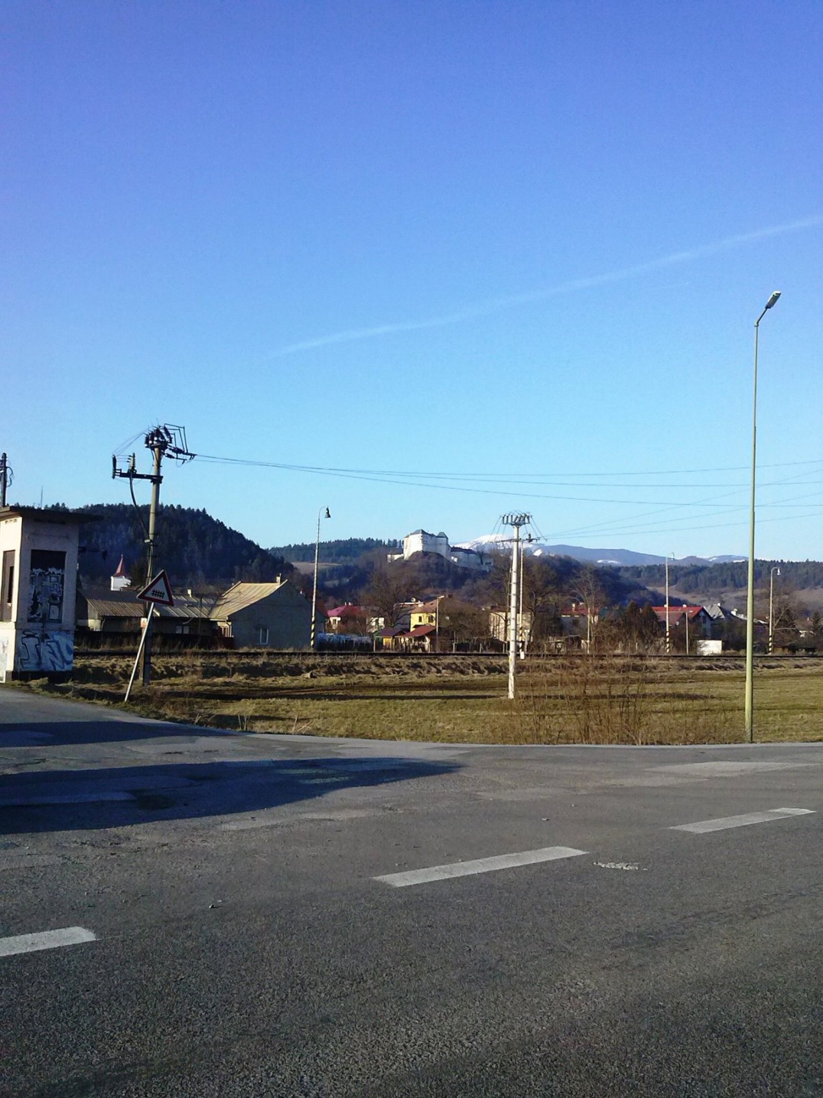 Hrad se nachází asi 10 km od Banské Bystrice v nadmořské výšce cca 440 m. Již z dálky nás vítal na kopci, kde čněl do výše nad obcí stejného jména. Vzadu za ním se vypínal v bílém objetí sněhu, možná i ledu vrchol buď Chopoku nebo Ďumbiera. Spíš to byl Chopok, který je o trochu blíže.