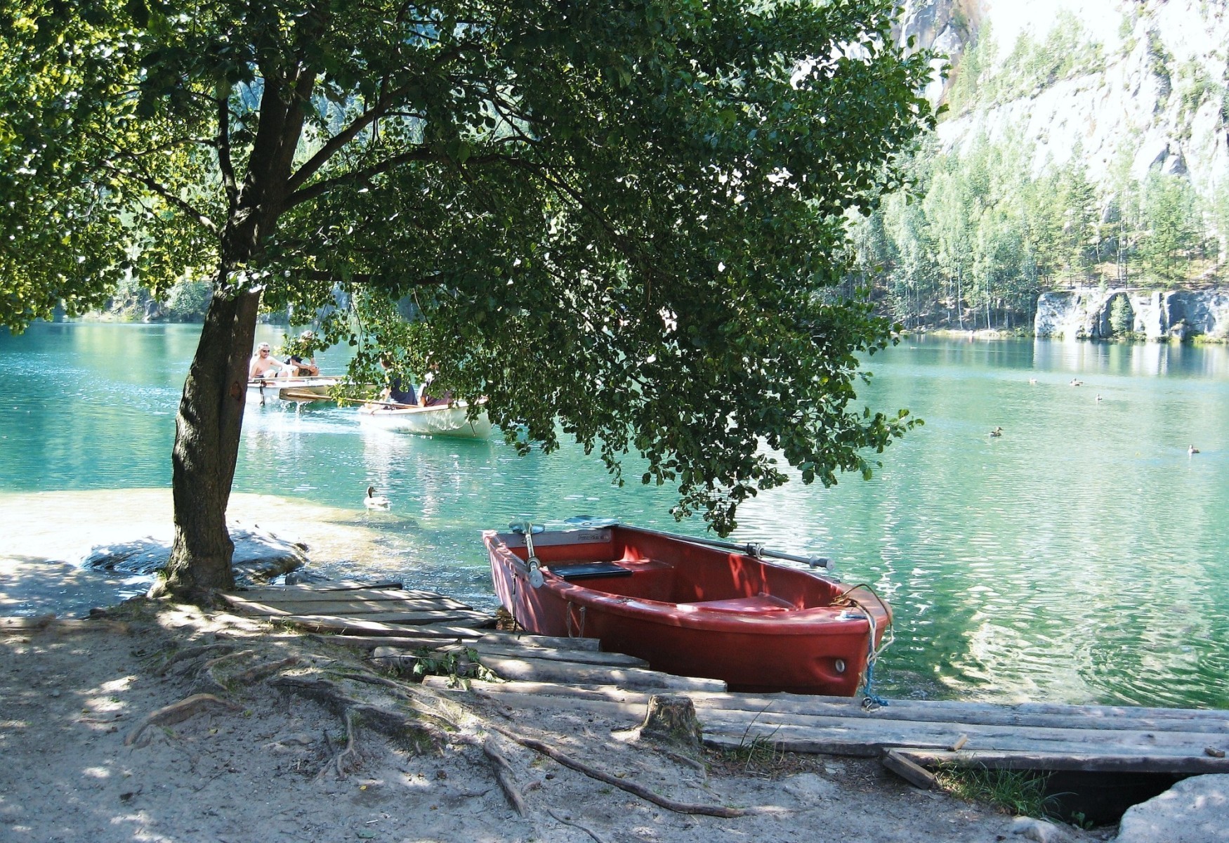 Procházíme pěšinou od hlavní brány, obdivujeme jezírko s průzračnou vodou, které lze celé obejít. Je to zatopená pískovna, koupání v něm ale mají povolené jen divokě kačeny, návštěvníci zde mohou v sezónu využít půjčovnu lodiček a celé jezírko i se zajímavými skalními zákoutími si mohou tak prohlédnout z lodičky. Z přední strany je pískovcová pláž. Udělali jsme si zde pár fotek a jdeme dál směrem do centra skalního města. Výška skal je fascinující, zvláště obduvujeme útvar Milenců, k našemu sklamání je našim fotoaparátem nevyfotitelný. Odtud jdeme na prohlídku malého vodopádu.