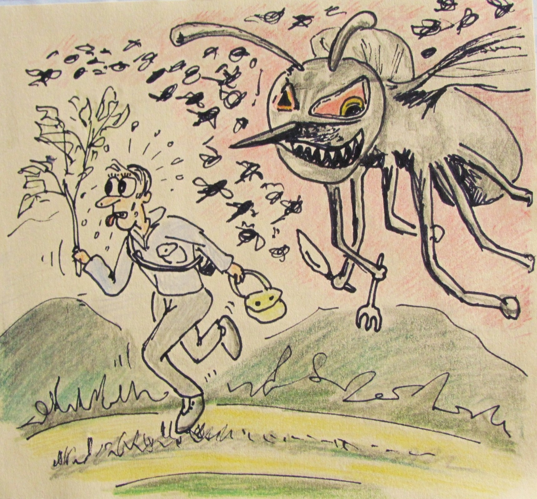 V posledním záchvatu duchapřítomnosti urvu z nejbližšího polosuchého stromku velikou zelenou větev, oháním se s ní po těch potvorách a pomalu se probíjím přes močáliska dál tím hlubokým úvozem. Místy musím přelézat nebo podlézat popadané kmeny a shluky keřů a jen se modlím, ať si nezlomím nohu, protože by mne ty BESTIE asi tak za půl hodiny ohlodaly až na kost !!! Celá anabáze už trvá víc jak čtvrt hodiny, ruka mi od zuřivého mávání téměř umdlévá - kam se hrabou prvomájové průvody z dob našeho mládí ! Pak se konečně dostávám na tu dobrou lesní cestu. Po ní úprk po obvodu kopce do sousedního údolí. Bzučící nepřítel to asi po 100 metrech letu konečně vzdává a vrací se na své teritorium !!! Nacházím potůček s čistou vodou, do půl těla se v něm umývám a chladím si bolestivé kusance a ostatní bitevní šrámy . A polykám kvanta životodárné chladivé tekutiny ! Myslím, že mi nikdo neuvěří můj dnešní zážitek. Nikdy a nikde jsem neslyšel a ani nečetl o tom, že by u nás existovala odrůda lidožravých much !! Buď je to vzácný endemit z období druhohor anebo jsou to mutanti, přivyklí na pravidelný přísun bílkovin ve formě zbloudilého turisty či slovenského dřevorubce !! Protože tento druh hmyzu ještě nebyl nikde popsán, dávám mu tímto odborný název "Lysáčkovo Hovado Člověkožravé" - (Lysackos Hovados Homopapátos) - latinský název ...