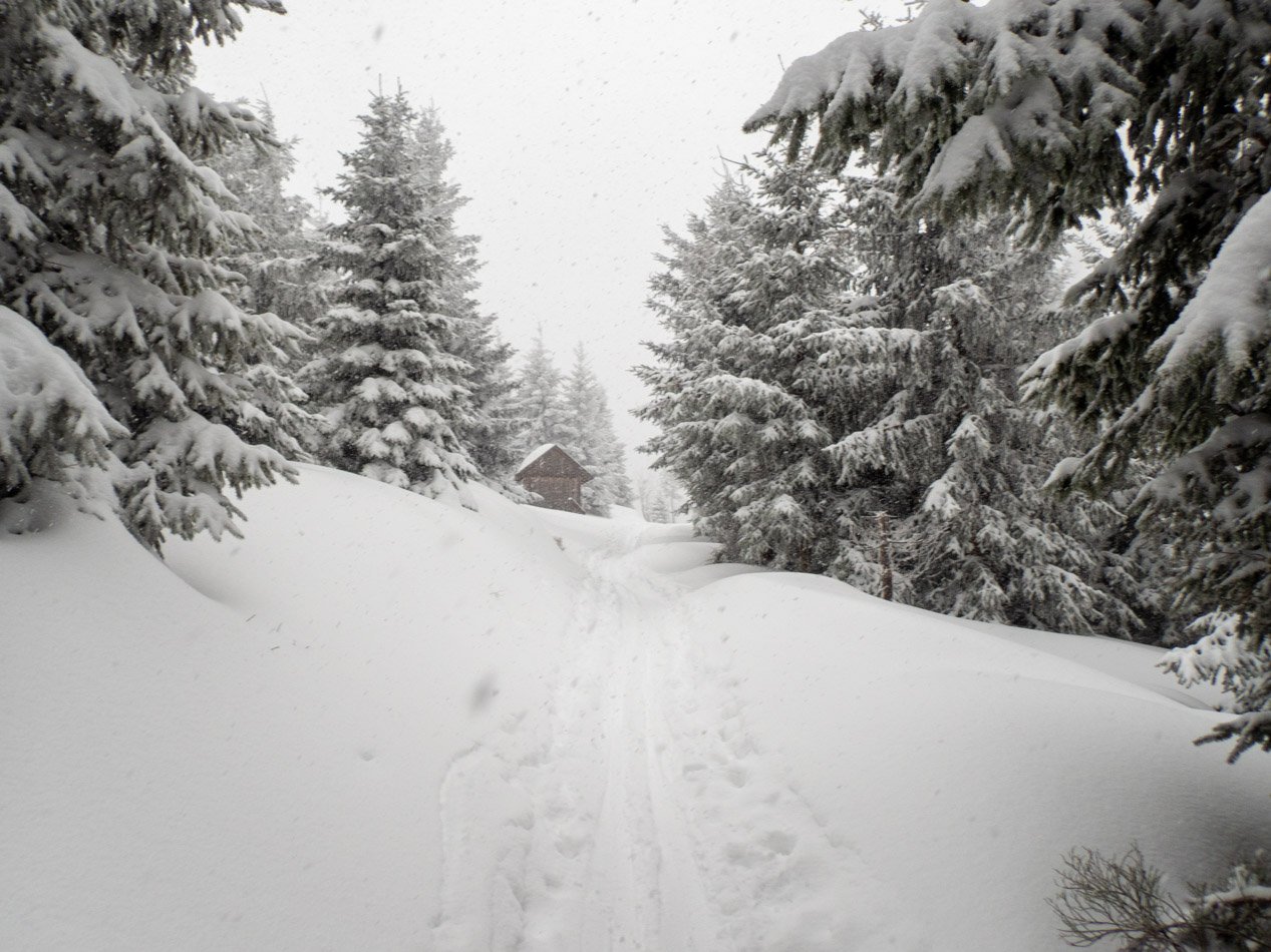Po většinu dne jemně ale celkem vydatně sněží, takže podmínky ve stopách by mohly být celkem slušné. I vzhledem k počasí tentokrát volíme oblíbenou klasiku, tedy směr Švýcárna. Bude-li něco dál, to se uvidí (nevidělo). V nástupu stopy se připravují na výpravu dvě děvčata, podle všeho celkem odvážné mladé ženy (podle vyprávění už alkohol můžou). Ve své výbavě mají plastové sněžnice ale hlavně na batohu připnutá prkna, tedy snowboardy. Než si vybalíme běžky jdou už napřed, s tím, že je beztak časem předjedeme.