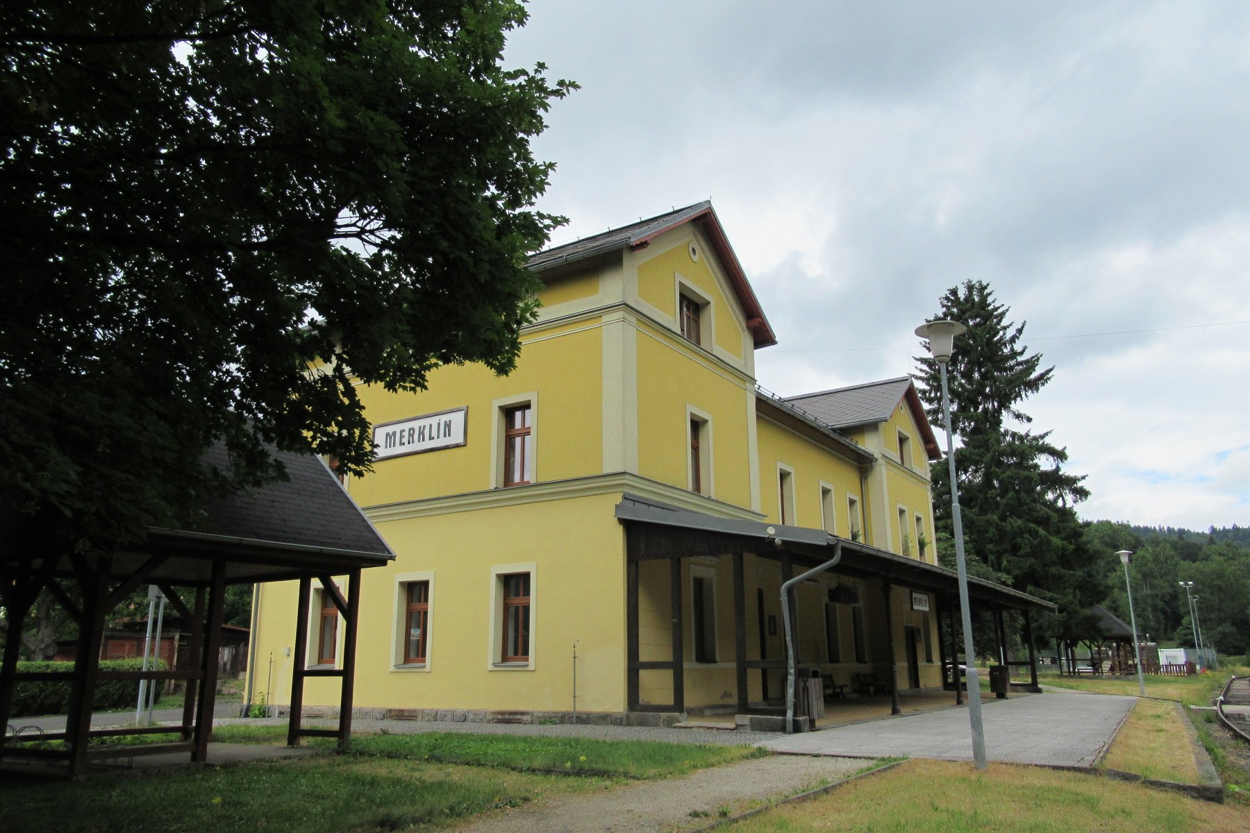 Parkujeme v blízkosti historické budovy nádraží, která pamatuje počátky zdejší železnice. Budova je po rekonstrukci, kdy chátrající budově byla vrácena podoba z doby jejího otevření. Má zde být informační středisko i malé muzeum, které bude věnováno místní železnici, dopravní kancelář a místnost pro drážní dělníky. Dnes v neděli je vše zavřeno. Okolí bylo proměněno v park a dětské hřiště.