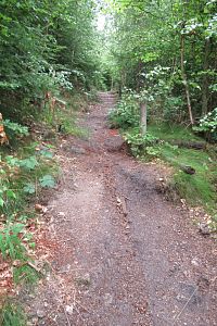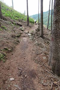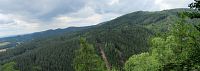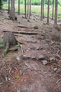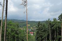 Pokračujeme po neznačené cestě. Dál klesáme. Je tu však spousta cest, na mapy.com nekoukám a tím se stalo, že jsme pro odbočení použili cestičku jinou, než tu, po které jsme chtěli jít. Zjistila jsem to, až když jsem se do mapy.com koukla, protože jsme najednou prudce klesali. Měli jsme ještě projít okolo jedné studánky a až u ní odbočit. Zpátky stoupat se nám nechce, jdeme dál. Tím jsme vynechali 7. zastavení. Zato zjišťujeme, že číslování zastaveních je najednou nějaké divné. Až podle mapy na zastavení to vidíme. Nejdřív byl značen ten kratší okruh, který začíná na náměstí v Hroznětíně - má č. 1 - 10 s tím, že č. 7 - 10 jsou společná pro oba okruhy. Delší okruh má samostatná zastavení č. 11 - 15, ale jejich číslování začíná od křižovatky okruhů. Tak už to víme a můžeme pokračovat po našem okruhu. Jsme na zastavení č. 8 s názvem Výhled. Tady má být altánek se zajímavými výhledy. Dnes je zde viditelné rovné místo, kde asi altán stál. Přes vzrostlé stromy už ani ten výhled není.