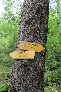 Tady si všímáme informační tabule, které seznamují návštěvníky s místními dvěma turistickými okruhy uvedenými pod společným názvem Hroznětínská zastavení. Trasy vedou v katastru obcí Merklín a Hroznětín. Povídání o nich je zajímavé. Kratší okruh je dlouhý 4 km a vede až do centra Hroznětína, ten delší má 5,5 km a vede přes vyhlídku Gloriet, kam jsme se chtěli jít podívat. Měníme trasu. Délka i náročnost obou tras jsou zhruba stejné. Tady se však dozvíme řadu zajímavostí. Jsou uvedeny na 9 zastaveních, z nichž některé jsou pro oba turistické okruhy společné. Celkem na obou trasách je asi 15 zastavení.