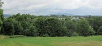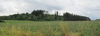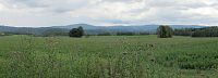 Zvlněný terénem jdeme ještě lesem a krmíme se malinami. Na jeho okraji odbočuje žlutá značka vpravo, my jdeme po naučné stezce jen kousek vlevo a pak po široké cestě vpravo. Naučná stezka není nijak značena, je dobré ji sledovat v mapy.com. Kromě zatažené oblohy vidíme i vzdálené kopce.
