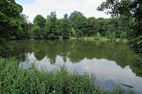 My se tady připojujeme na zelenou trasu, která sem vede od zámku po silnici a po silnici a cyklotrase pokračujeme okolo rybníka. K nádraží a tím pádem k autu už to máme kousek.