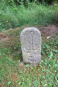 Procházíme bývalou čtvrtí Selský vrch. Zůstaly zde jen dva domy, ostatní byly po válce zbořeny. V lese před námi prý můžeme vidět pobořené sklepy, kamenné základy domů, mezníky s erbem hraběte Nostice (kotva).