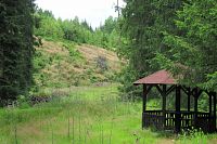 Poslední cca 2 km vede naučná stezka po silnici, ale naštěstí je provoz nepatrný. Nejdřív klesáme z kopečka, abychom mohli zase stoupat do kopečka. Ani jedno není nic náročného. Míjíme odbočku k turistické základně Sluníčko. Bývalá pionýrská základna Sluníčko vznikla r. 1971 adaptací hraběcí hájovny Amálka, která do r. 1925 patřila hraběti Nosticovi. Dříve tu byly asi 4 objekty. Jedno rekreační stavení ještě stojí u silnice, ruiny dalších dvou jsou zarostlé lesem a vegetací. I dnes je budova s oblibou pronajímána pro pořádání dětských letních táborů, ale slouží zájemcům i k víkendovým pobytům. Podívat se k ní nejdeme, jsem ráda, že se blížíme k cíli a další kroky přidávat nechci.