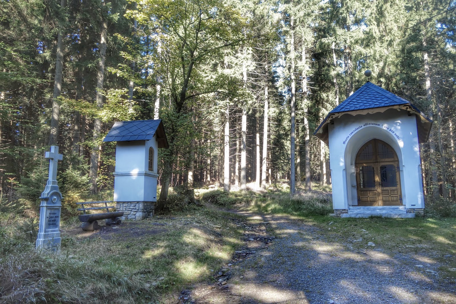 Naše cesta nevede přímou cestou jak u jiných procházejících turistů. Od parkoviště se vracíme kousek ke kostelu (637 m.). Zde bohužel míjíme odbočku a tak se na modrou tur. trasu napojujeme o něco později. Na rozcestí modré a červené tur. trasy procházíme kolem opravené kaple Panny Marie a pokračujeme kolem Adéliného pramene až k rozcestí "Nad Adéliným pramenem", kde se napojujeme na přímou cestu ze Stříbrnice. Dlouho se ale na této frekventované cestě nezdržujeme a hned v další zatáčce pokračujeme po málo frekventované zelené tur. trase horší cestou do prudšího kopce. Zelená tur. trasa kopíruje hranice mezi Českem a Polskem a vede většinou o něco níže pod červenou tur. trasou. V jeden moment se nám i otevírá pěkný pohled na polskou stranu.