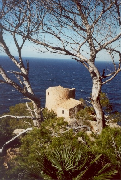 Opouštíme psy a kočky a jdeme si prohlédnout přes 400 let starou strážní věž Torre Cala Basset na pobřeží. Část cesty vede řídkým borovicovým lesem. Sama věž je na skalním výběžku obklopená keříky a zakrslými palmami. Nikde ani živáčka. Holky vystavují svá bílá těla sluníčko. Já tomu nějak moc neholduji, takže jdu pořádně prozkoumat věž. Do prvního patra se dostávám přes úzký otvor ve zdi, kde je místo schůdků jen několik železných skob. Z hora je překrásný pohled na Dračí ostrov. Dragomeru jsme tento den mohly obdivovat mnohokrát, ale odsud byla jako na dlani. Dokonce byl vidět maják na jednom z jejich výběžků. Dělám si několik fotek i experimentálních přes okýnka ( vyšly bezvadně ). Když jsme se dosyta vylenošily a naslunily bereme batohy a vyrážíme do kopce podél pobřeží k troskám bývalého kláštera trapistů. Ještě před výstupem potkáváme skupinu německých turistů – důchodců. Je to k nevíře. V létě mi němci připadají o dovolených otravní. Je jich všude plno. Svým hlučným chováním dávají stále o sobě vědět. Ale tady v zimě na Mallorce mi připadají úplně jiní. Veselí a usměvaví. Je to asi jiná sorta lidí. Nejsou to ti, kteří si v létě jezdí za levný peníz vyrazit z kopýtka.