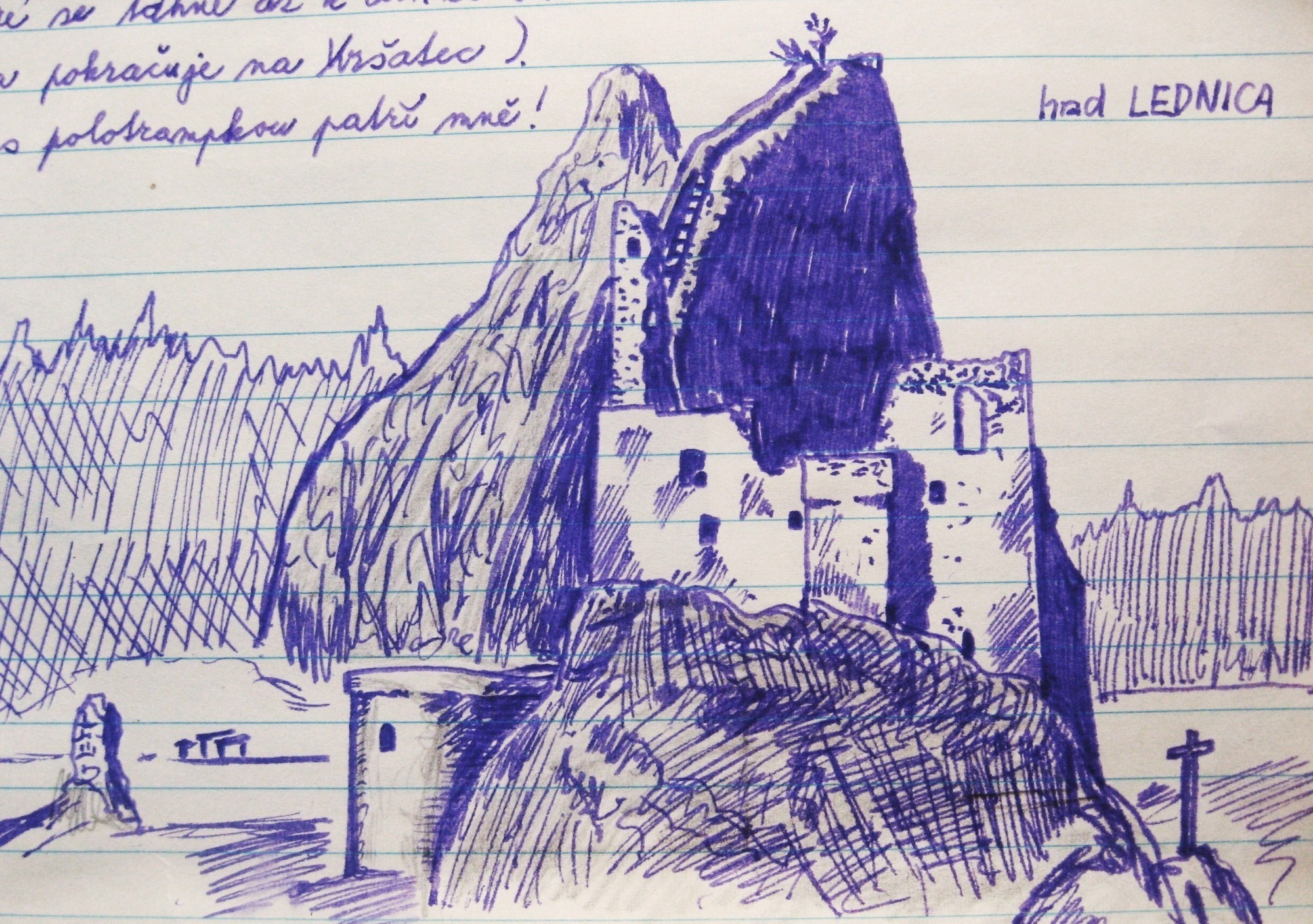 Lednický hrad řadím mezi nejzajímavější zříceniny, které jsem kdy v životě spatřil. A taky není divu !! Představte si ohromnou skálu, na které vidíte zříceniny paláce a věže, ale vy se tam nemáte jak dostat. Obcházíte skálu jako mlsná kočka a ejhle : ona je tu na úbočí skály nad nádvořím veliká a zachovalá obézní věž - dělová bašta. Ve věži železné schodiště, nahoře vysekaný tunel přes skálu a pak už jste konečně ve vlastní zřícenině hradního paláce. Nad ním Trosky hlavní věže a od ní k vám visí konec tlustého lana. Neodoláte pokušení, vyšplháte se po něm na úroveň věže a zůstanete oněmnělí úžasem : skála tu tvoří uzounký a strmý hřbítek, který se nad vámi táhne do výšky a v něm jsou vytesány schody -pravé schody do nebe !!! Na vrcholku malá kruhovitá bašta, za ní propast a hlavní bradlo Lednických skal, na druhou stranu nádherný pohled na městečko hluboko pod vámi a širé okolí... ( A člověk zde může meditovat nad bohatými dějinami hradu a pozorovat krajinu, kde se ty dějiny tvořily...) A taky je tu vítr ! A dost silný k tomu, co nás čeká za hrůzy při zestupu. Hanička mi chce na vrcholu ukázat, jak je odvážná - to asi za tu myš - a leze na osamělý strom. Mám o ni strach a tak ji tahám za nohu dolů, aby náhodou nespadla. Dole při úpatí hradu je totiž křížů už víc než dost !!!
