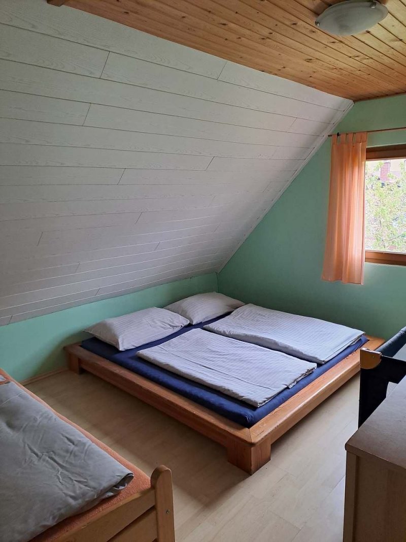 Chalupa v obci Křivoklát: 4 ložnice, celkem pro 4 až 15 osob. Orientační cena (za osobu za noc): léto 500kč.