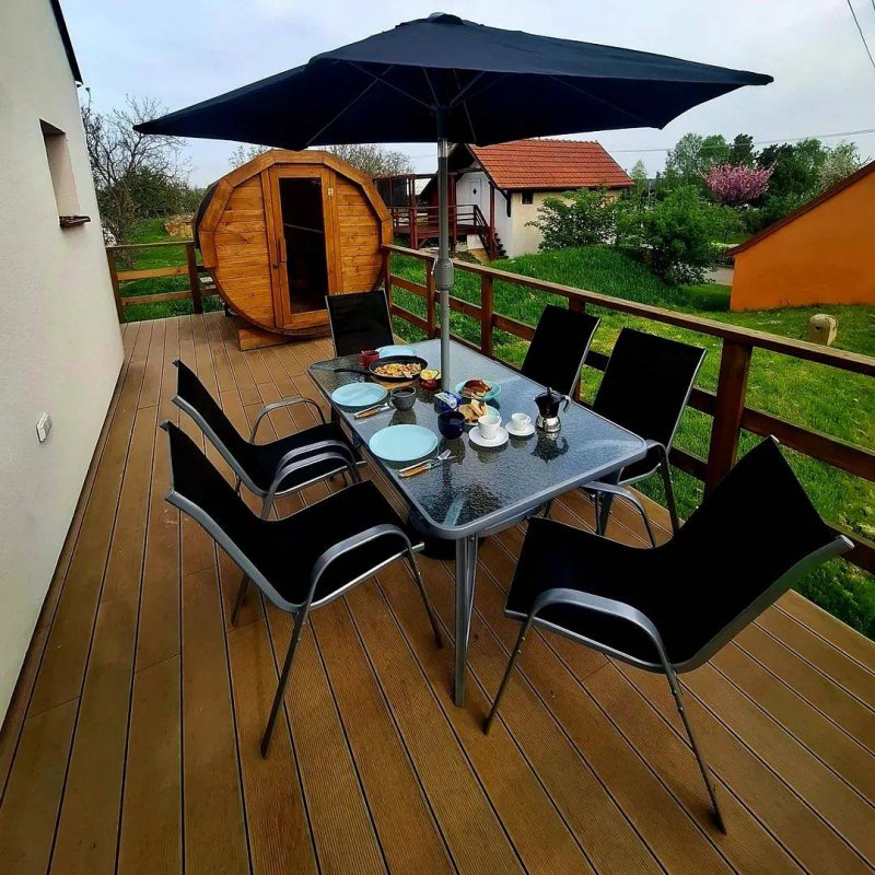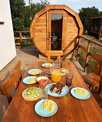 Po výkonu nebo před skleničkou můžete pro odpočinek využít naši sudovou finskou saunu, která je vám k dispozici přímo na terase.
