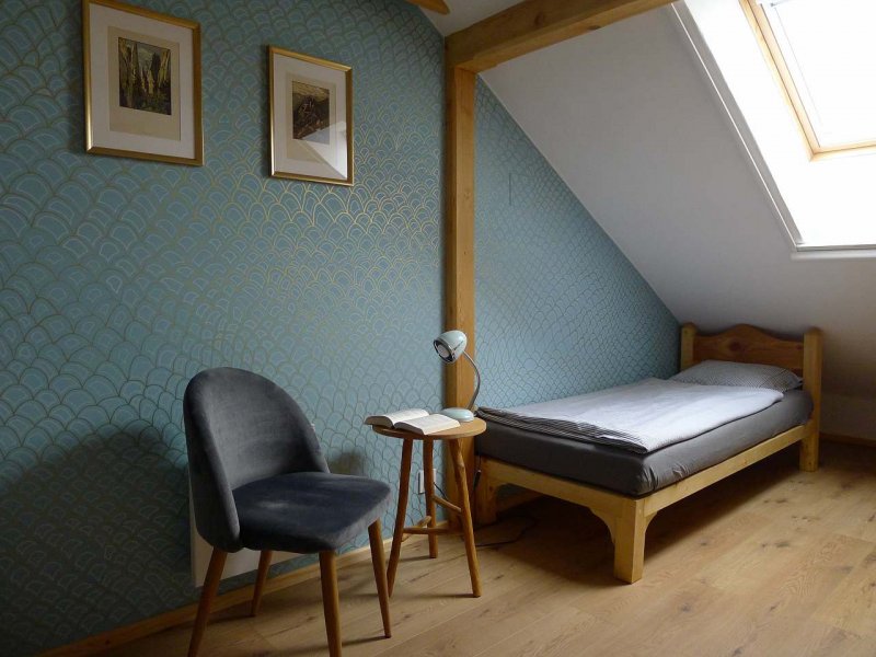 Nabízíme ubytování pro 4 - 5 osob ve zrenovované stodole s terasou a výhledem do krajiny. Rekreační objekt se nachází v malebné vesničce Mokrý v Českém ráji, která ještě žije svým poklidným venkovským životem, daleko od ruchu velkoměsta. Apartmán se nachází v 1.patře nad garáží sousedního domu a je přístupný po vnějším schodišti přes pavlač, což hostům zaručuje naprosté soukromí. Z pavlače je vstup do obytné místnosti s kuchyní, odkud je dále přístup na vnější terasu s posezením. Najdete zde i samostatnou koupelnu s umývadlem, sprchou a wc a schodiště vedoucí do podkroví. V podkroví jsou 2 malé pokoje pro 2 a 3 osoby (z nichž jeden je průchozí) a samostatné wc s umývadlem. V obývací místnosti je k dispozici smart televize a pokrytí WiFi. V koupelně je pračka. Pro děti jsou připravené hračky a dětské knížky. Pro ty nejmenší máme dětskou postýlku, vaničku a jídelní židličku. Cyklisté se přímo u apartmánu mohou napojit na cyklostezku podél Jizery. Do lesa dojdete pěšky za 10 minut a k nejbližšímu přírodnímu koupání dojedete na kole také za 10 minut. V zimním období je k dispozici finská sauna (příplatek 600 Kč). Ubytování je ideální pro rodiny, páry či skupinu přátel. Ubytování nedoporučujeme pro starší osoby s omezenou pohyblivostí (prudké schody).