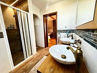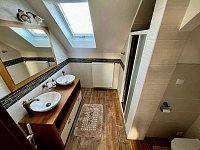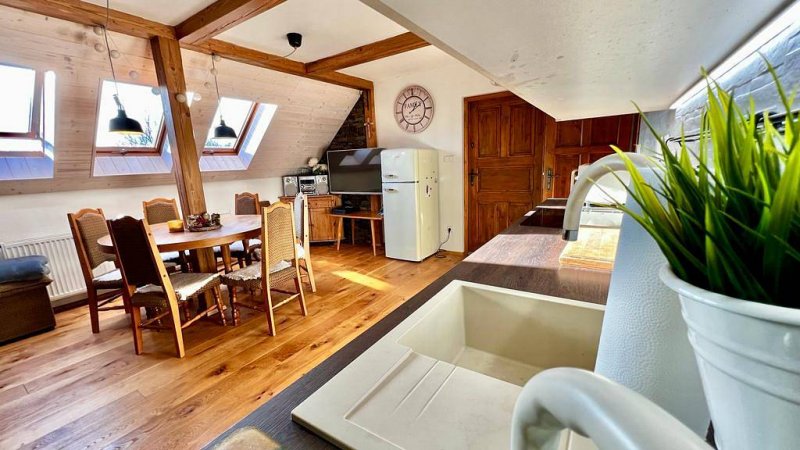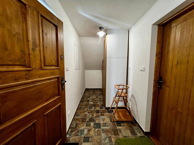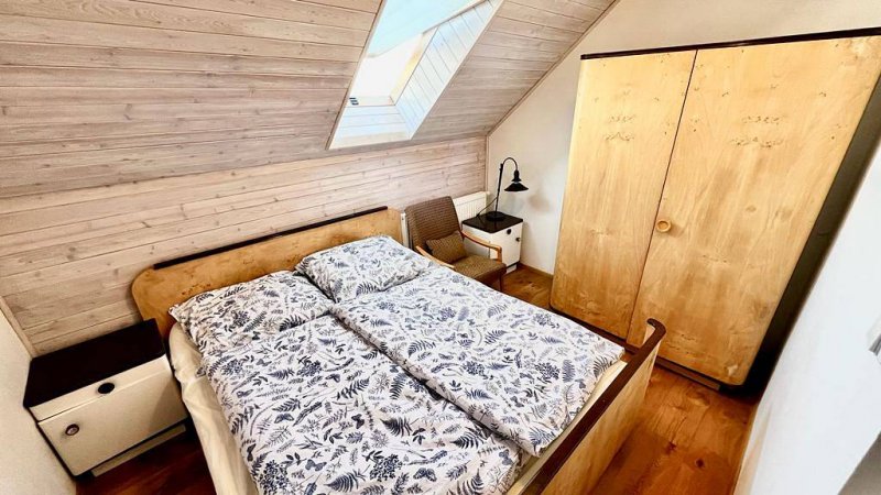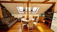 Pronajímáme nově zrekonstruovaný apartmán v podkroví rodinného domu, na kraji obce a v blízkosti lesa, přímo v srdci malebné přírody CHKO s malebnými výhledy. Nabízíme 6 lůžek k přespání. V samostatné ložnici je manželská postel, ve společném prostoru jsou 2 jednolůžkové postele a rozkládací gauč pro 2 osoby. Součástí apartmánu je samostatná koupelna s WC a sprchovým koutem. Plně vybavená kuchyň, jídelní stůl, TV a Wi - Fi. Apartmán má vlastní vchod, oddělenou chodbu, místo pro kočárek, cyklistická kola, lyže, apod. Nad schodištěm je v chodbě prostorná skříň k uložení věcí a věšák s botníkem. Venku lze využít přístřešek s posezením a zahradním grilem. Parkování je přímo u domu pod střechou pro 2 vozidla.