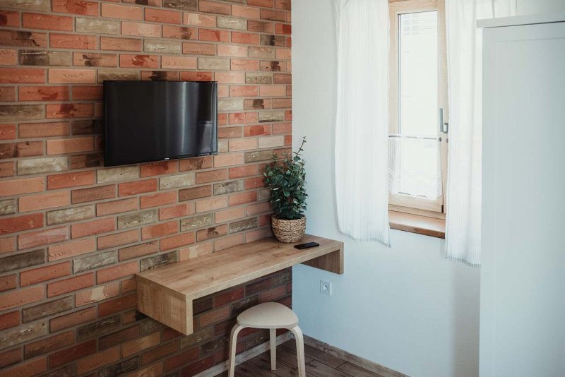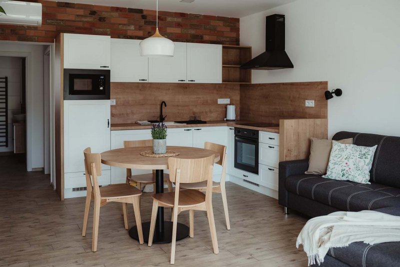 V samostatném pokoji je dvoulůžková postel, televize a úložná skříň. Další dvoulůžko najdete v hlavní části apartmánu společně s kuchyňskou linkou, jídelním stolem, rozkládací sedačkou, televizí a dalším úložným prostorem.