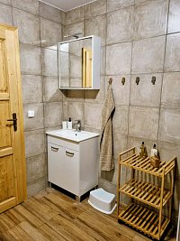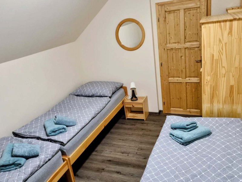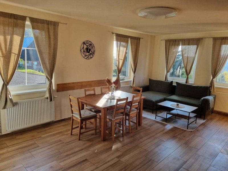 Tato světlá a prostorná chalupa na Benecku (s možným rozdělením na dva zcela samostatné apartmány) nabízí ideální zázemí pro rodiny i více rodin, které hledají pohodlí, klid a přímý přístup k přírodě. V přízemí každého apartmánu vás přivítá útulná společenská místnost s velkým jídelním stolem, dostatkem místa pro společné večery a krbovými kamny, které dodají atmosféru každému pobytu. Plně vybavená kuchyň s indukční deskou, troubou myčkou a lednicí umožní pohodlné vaření i během delších pobytů. Společenská místnost je doplněna o velkou chytrou TV a rozkládací pohovku, na které se pohodlně vyspí další dvě osoby.