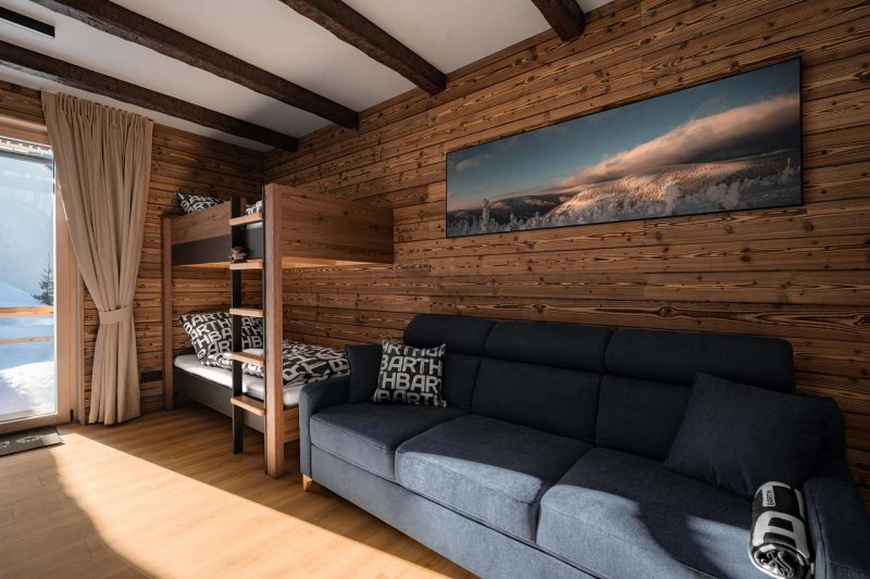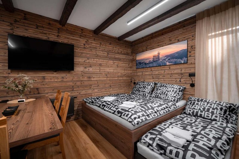 Apartmánový dům BARTH Holiday nabízí celkem 6 luxusně vybavených apartmánů k pronájmu v přímém sousedství s celkovou kapacitou až 32 lůžek, což je skvělá volba pro více rodin nebo skupiny přátel hledající pohodlí a soukromí. K ubytování je bezplatné venkovní parkoviště přímo před domem. Samozřejmostí u každého apartmánu je buď terasa nebo balkón. V některých apartmánech si můžete v zimě navodit příjemnou atmosféru zatopením v krb (dřevo je plně k dispozici). Součástí objektu je také wellness centrum, kde máte v ceně pobytu 2 sauny a 2 zážitkové sprchy, kde si dopřejete dokonalý odpočinek po dni stráveném na horách. Naše wellness apartmány se nacházejí v klidné lokalitě u lesa, kam zavítá i lesní zvěř, a přitom jen pár minut od atrakcí i sjezdovek. Ať už přijíždíte za zimními sporty, letními túrami nebo prostě jen za relaxací, zde najdete ideální útočiště. V blízkosti je lanovka, která vás vyveze na všechny atrakce moderního resortu na Dolní Moravě (Stezka v oblacích, Skybridge 721,Mamutí horská dráha, lyžařský areál a v létě bike traily a pěší trasy na vrcholky hor). Vyzkoušet můžete také paragliding, horské koloběžky, crossové tratě nebo zábavné atrakce pro děti jako Mamutíkův park. Pokud patříte mezi milovníky zimních sportů, kraj pod Králickým Sněžníkem je pro Vás perfektní lokalitou.