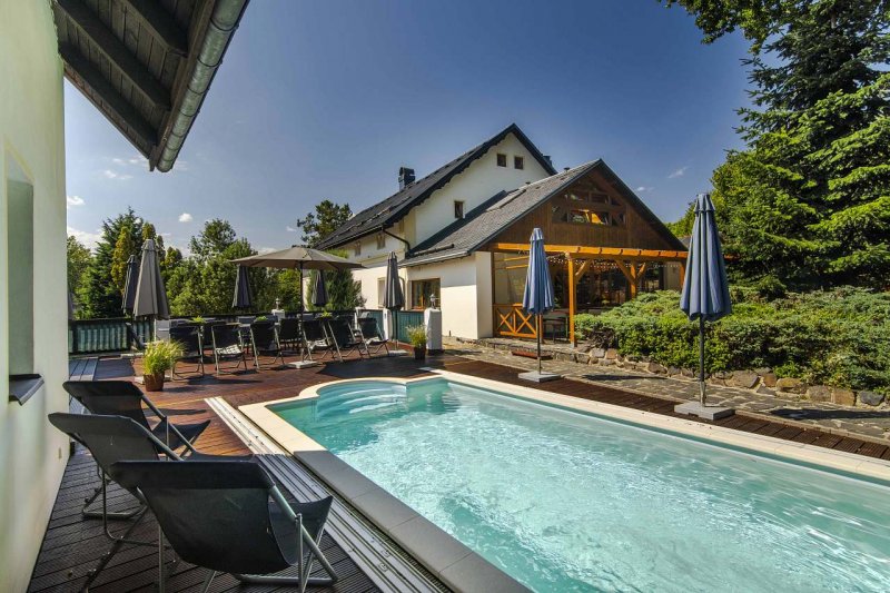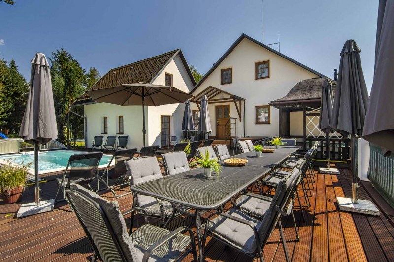 Chata v obci Česká Kamenice: 6 ložnic, celkem pro 6 až 18 osob. Orientační cena (chata za týden): léto 25.000kč, zima 27.000kč.