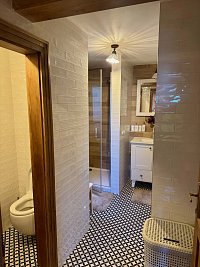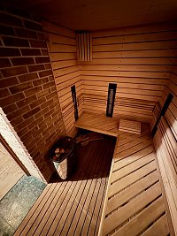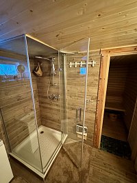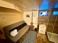 Ve sklepě je infrasauna s odpočinkovou místností a sprchou. Voda je z vlastního vrtu a po sauně má ideální teplotu na rychlé ochlazení. Ve sklepě je také zásoba suchého dřeva pro kachlová kamna v obývacím pokoji. U chaloupky se nachází příjemné venkovní posezení s výhledem na Jizerské hory a Tanvaldský Špičák s možností grilování (mimo zimní období) na prostorném ohništi pro opékání buřtů. Sportovní vybavení (kola, lyže, kočárek) je možné bezpečně uložit a uzamknout do sklepa, který má vlastní vchod zvenku.
