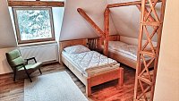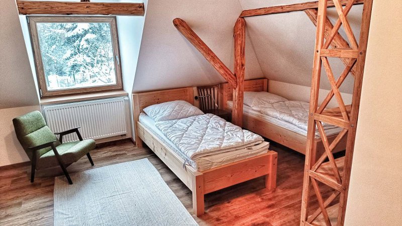 Apartmán v obci Markoušovice: 3 ložnice, celkem pro 1 až 10 osob. Orientační cena (za osobu za noc): léto 600kč, zima 550kč.