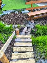 K chalupě dále patří bazén s lehátky, slunečníky, ohništěm, dřevěným domečkem s klouzačkou a trampolínou - pozemkem protéká potůček. Tato část zahrady je přístupná z parkoviště po schodech (v údolíčku) a není plně oplocena.