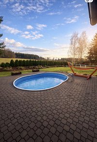 Naše chaloupka v Českém ráji na samotě u lesa je ideálním místem pro klidnou rodinnou dovolenou v přírodě. Okolí nabízí krásné výhledy do lesa a dostatek prostoru pro odpočinek i hry dětí. U chaloupky najdete venkovní bazén, terasu s krytou pergolou a lehátka, kde si můžete užívat slunce i příjemný stín. Pro děti je připravené malé dětské hřiště, takže o zábavu je postaráno.