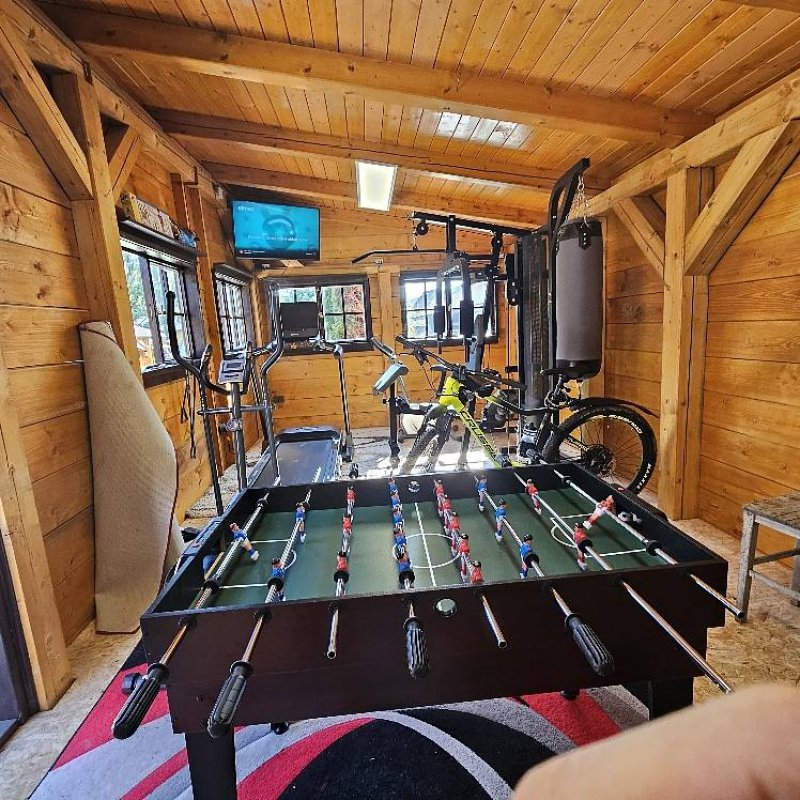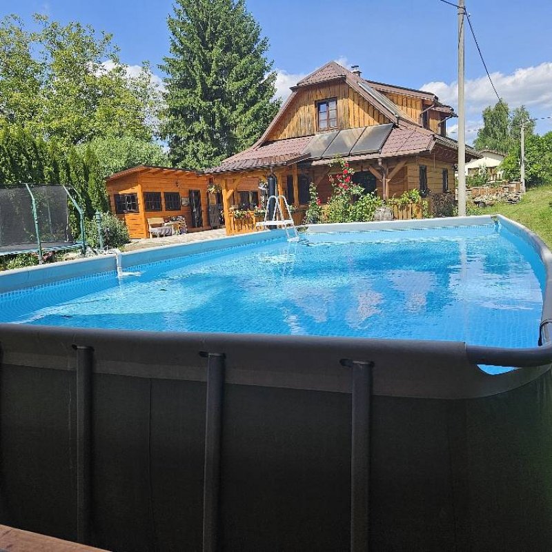 Chalupa Anička se zahradou se nachází ve středu obce Halenkov. Jedná se o dřevěnou chalupu 3+1 s přízemím a s podkrovím. Na zahradě se nachází vetší nadzemní bazén ( 7,5x3,5x1,25 m) k dispozici v letní sezoně od. Dále krytá nadstandartní švédská vířivka IQue ÜTO Platinum, 3 čerpadla, 6 masážních pozic, pro 3 - 5 osob mj. i s 88 masážními tryskami a speciálními tryskami na chodidla Akuflex - za příplatek 450 Kč/hod.. Vířivka je v provozu celoročně. Vedle vířivky je dřevěný domeček pro děti i s malým stolkem a malými židlemi, s postelí a spacáky (možnost přespání v létě), dále houpací dřevěná lavice, pískoviště s hračkami, houpačky, dětský bazének, skluzavka 170 cm vysoká, malý pinpongový stůl s raketami ( v nepříznivém počasí možnost hraní ve fitku ), větší trampolína s ochr. sítí, kovové ohniště s lávkami nebo zahradní gril s kompletním příslušenstvím. K dispozici možnosti hřiště - sítě i rakety na badminton, tenisové rakety i míčky na tenis ( nedaleký 150m vzdálený sport. areál ), dále k dispozici větší trampolína i s ochrannou sítí, 3 dětské kola, hračky, odrážedlo ( viz. foto ). Dále jsou k dispozici k odpočinku 4 ks polohovacích lehátek + stůl. Dokončeno malé fitko ve dvoře vedle chalupy ( čínky, posilovací - masážní míče, posilovací věž vč. box. pytle a rukavicemi,, kvalitní běží pás vč. monitoru, švihadlo, karimatky, dva šlapací posilovací stroje, elektronické šipky, stolní fotbálek+14 dalších her, nová TV, internet vše v samostatné dřevěné budově u chalupy (využití i při nepříznivém počasí). Před chalupou směrem k zahradě krytá pergola na posezení, jídlo apod. z masivu se stolem a lavicemi. Možnost za příplatek projížďka na čtyřkolce 625m³, případně odvoz a dovoz autem z okolí. Občanská vybavenost v obci - krásný sportovní areál pro děti i dospělé asi 150m od chalupy Anička, dráha pumtrack na kola, basket. hřiště, šplhací stěna, prolézačky, pískoviště pro děti, fotbalové i tenisové hřiště vč. občerstvení. Dále nákupní středisko Coop, restaurace Lidový dům, pizzerie Ponko, restaurace u Orságů - na Dolinách (místní část Halenkova), Vietnamská večerka, pošta, Obecní úřad, club Na palubě (občerstvení - prodej zdravá výživa) vše ve středu obce Halenkov - dostupnost všeho cca do 250m. Nádherná, klidná příroda v blízkosti lesů, mnoho překrásných údolí na procházky, jízdu na kolách, sbírání hřibů, koupání na Balatoně apod.