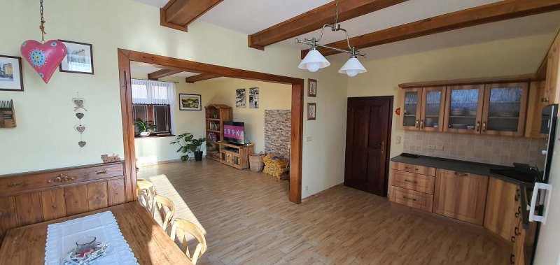 Apartmán v obci Albrechtice v Jizerských horách: 2 ložnice, celkem pro 2 až 5 osob. Orientační cena (apartmán za týden): léto 10.000kč, zima 14.900kč.