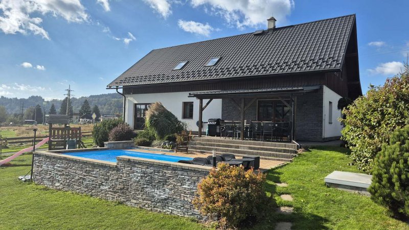Novostavba nadstandardní chalupy v centru Deštného na krásném místě s výhledem na sjezdovky a okolní krajinu, s bazénem a vířivkou v relaxační místnosti s výhledem na sjezdovky. Samotná poloha chalupy je předurčena jak ke klidné rekreaci a odpočinku v čisté přírodě, tak zároveň výborná je dosažitelnost do centra, k restauracím či obchodům. K samostatným sjezdovkám (největšímu středisku Orlických hor) pak dojdete i pěšky - cca 500 m. Nejbližší restaurace je vzdálena cca 100m. Jedná se o chalupu o ploše 170 m2,stylově a zároveň moderně zařízenou, dostatečně prostornou s veškerým komfortem dle současných trendů bydlení, se 16 - ti lůžky, vířivkou v relaxační místnosti, bazénem, vhodnou k rodinné rekreaci i ke společné rekreaci skupiny lidí. Objekt je celoročně dostupný s parkováním pro max 5 osobních aut.