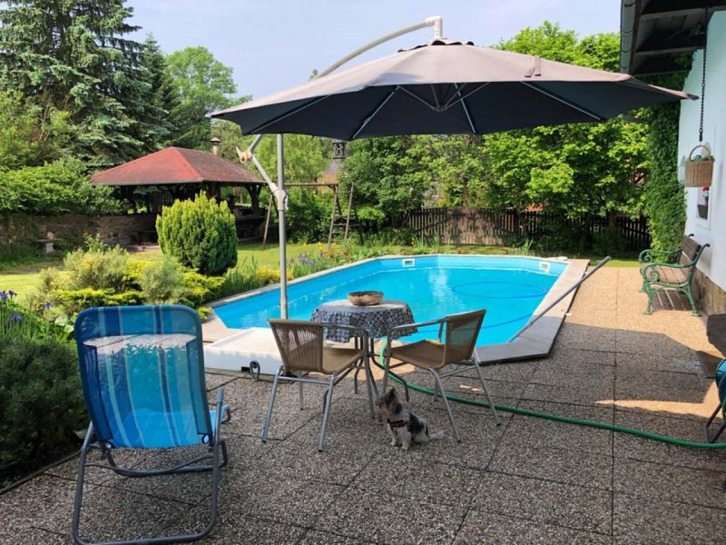 Na venkovní relaxaci nabízíme: venkovní bazén se slanou vodou UV lampou a protiproudem. Hloubka bazénu je 160cm, délka 8m, šířka 4m. Bazén je po celou dobu pobytu k dispozici. K chalupě také náleží venkovní sezení s grilem. (Dříví na gril po domluvě. ) Celý objekt je oplocen.