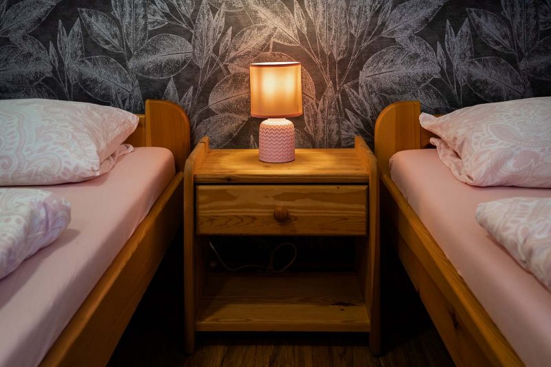 Chalupa v obci Červený Potok: 4 ložnice, celkem pro 3 až 8 osob. Orientační cena (za osobu za noc): celoročně 500kč.
