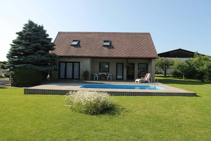 Samostatný objekt s bazénem na zaplocené zahradě za rodinným domem majitele. V přízemí objektu se nachází vstupní chodba, ze které se vchází do kuchyně s jídelnou a do koupelny. Z kuchyně s jídelnou je vstup do obývacího pokoje a do podkroví, kde se nacházejí dvě ložnice.