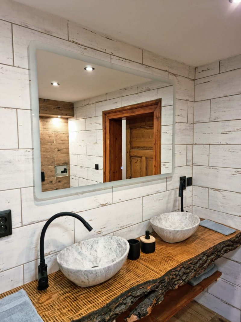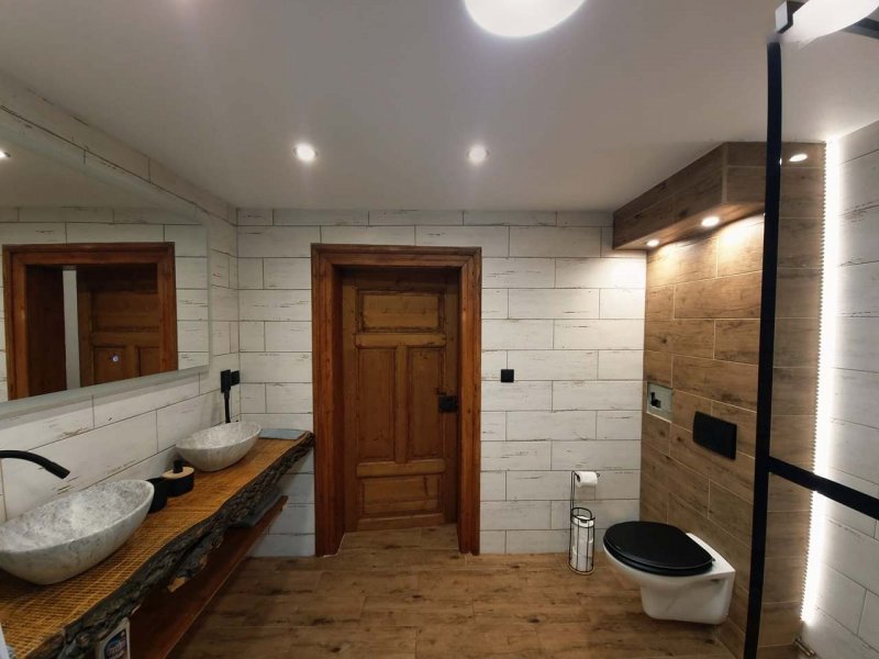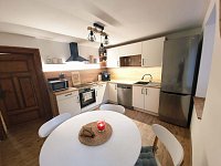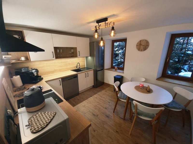 Interiér s hojně využitým dřevem vytváří příjemnou, útulnou atmosféru. V chladnějších dnech si užijete pohodové večery u krbových kamen ve společenské místnosti s TV, v létě pak posezení na kryté terase s grilem nebo odpočinek ve venkovní vířivce s výhledem do krásné přírody. K dispozici je plně vybavená kuchyň s elektrickým sporákem, mikrovlnnou troubou, elektrickou troubou, automatickým kávovarem Saeco (na zrnkovou kávu), myčkou a lednicí s mrazákem. Hosté mají k využití dvě koupelny se sprchovým koutem a WC. K dispozici je pračka se sušičkou. Samozřejmostí je Wi - Fi a parkování až pro čtyři osobní automobily přímo u objektu.