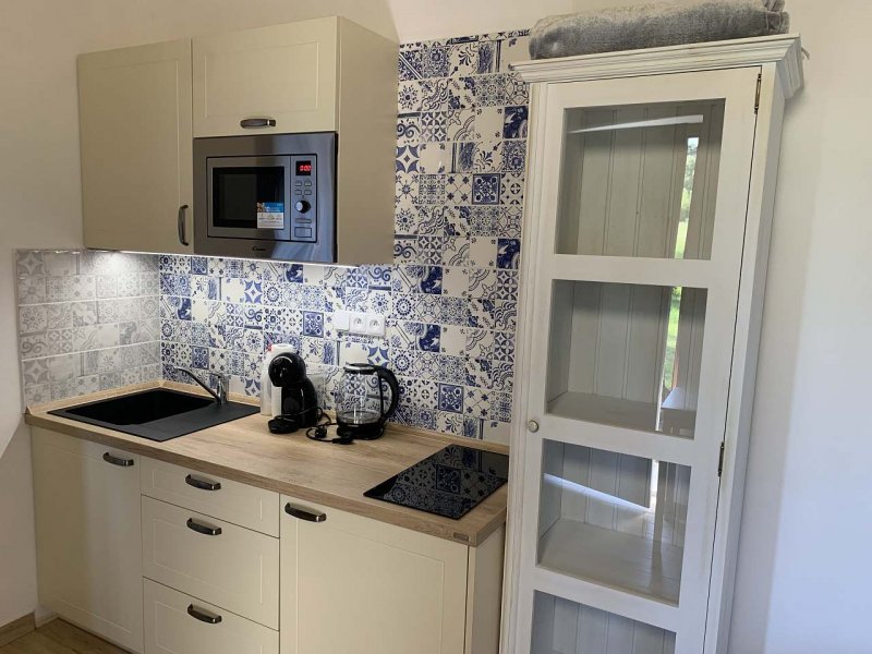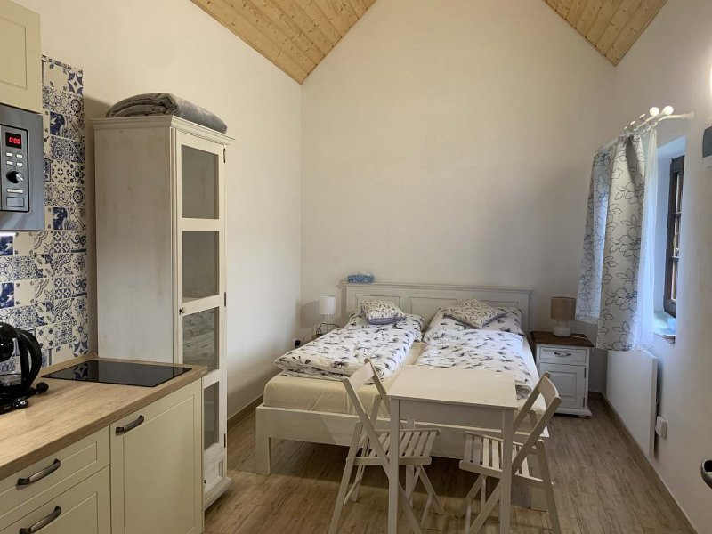 V chalupě jsou dva samostatné apartmány a studio pro dvě osoby se samostatným vchodem a terasou (studio dokončené v roce 2023). Na samostatném vedlejším pozemku je dále umístěn nový malý domeček velikosti studia, který má posezení na zahradě a ohniště a lze si ho pronajmout samostatně nebo v kombinaci se studiem/apartmány v chalupě. Lze si pronajmout apartmán v přízemí, apartmán v 1.patře, studio, domeček, jakékoli kombinace nebo celou chalupu a domeček.. Každý apartmán, studio a domeček má venkovní posezení, které si lze přesouvat dle chuti, na zahradě je klasické ohniště a zděné ohniště s grilovací mříží, druhé zděné ohniště je u domečku.