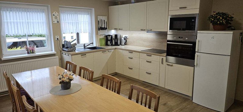 Prostorná chalupa k pronajmutí v Nové Olešce. /WIFI/. V přízemí je obývací pokoj 29 m2,který je vybaven sedací soupravou, jídelním stolem, krbovými kamny a televizí/satelit/DVD. Kuchyně s jídelnou, vybavená ledničkou s mrazákem, mikrovlnou troubou, varnou konvicí, kávovarem DēLonghi Dinamica, kávovarem tassimo/kapsle/topinkovačem, toustovačem, myčkou nádobí, elektrickou troubou, sklokeramickou deskou a pračkou. Samostatné WC. Koupelna se sprchovým koutem, umyvadlem a WC. V prvním poschodí je také 1WC a sprchový kout s umyvadlem.