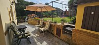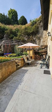Na zahradě možnost grilování a posezení (zahradní nábytek, slunečník), dětská houpačka.