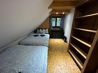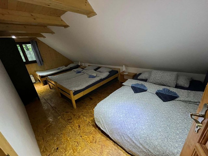 Chalupu jsme v letech 2009 - 2012 kompletně zrekonstruovali a připravili k ubytování pro 13 osob ve třech pokojích. Další rekonstrukce a zlepšení proběhla začátkem roku 2024.K dispozici Vám bude prostorná světnice s kachlovými kamny a kuchyňskou linkou (včetně myčky na nádobí). Dále velká společenská místnost s krbem v bývalém kamenném chlévě a prostorná veranda s posezením. Chalupa je vybavena dvěma koupelnami a dvěma toaletami. V přístavbě je k dispozici finská sauna. Pro děti je u chalupy k dispozici domek na stromě a stůl na stolní tenis.