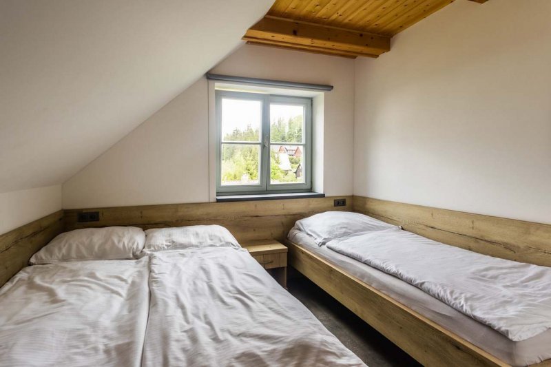 Apartmán v obci Ostružná: 5 ložnic, celkem pro 2 až 17 osob. Orientační cena (za osobu za noc): celoročně 790kč.