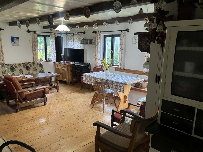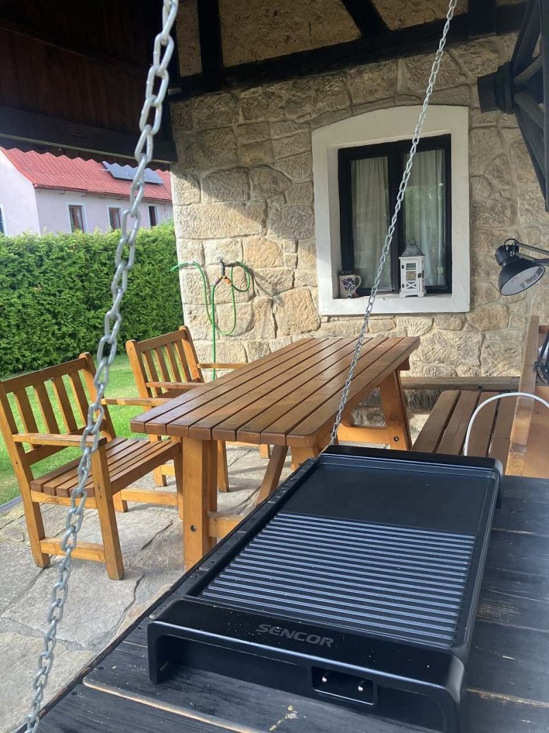 Vedle chalupy je hospoda se zastřešenou zahrádkou, na kterou navazuje oplocené dětské hřiště s prolejzačkama. Ideální pro příjemné posezení s dětmi pod dohledem.