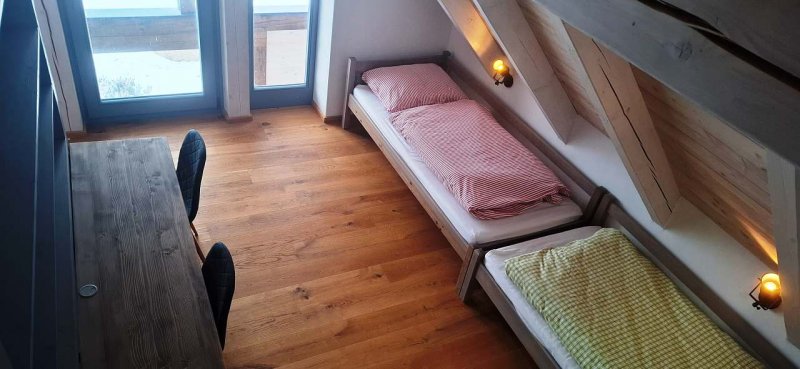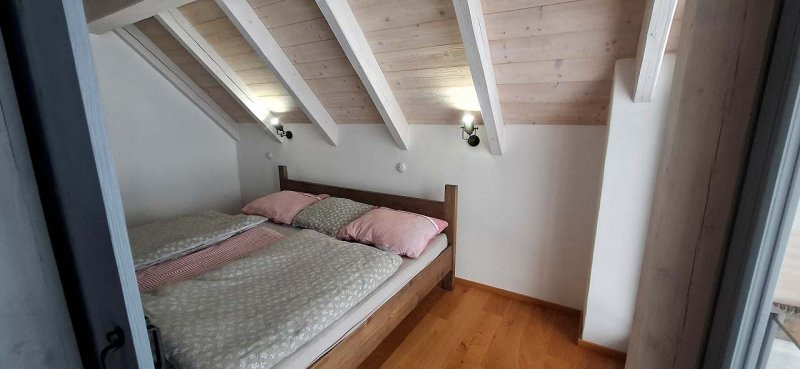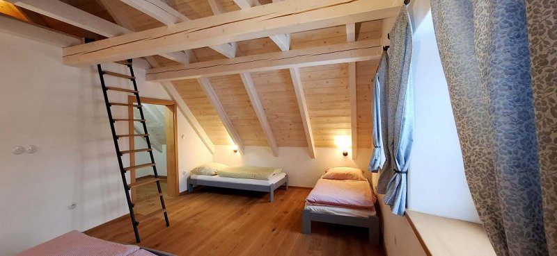 Celková kapacita je až 16 osob. V přízemí se nachází velký obytný prostor s jídelními stoly, plně vybavenou kuchyní, kachlovými kamna s ležením, sedačkami. V přízemí je též ložnice se čtyřmi lůžky, samostatné wc a samostatná koupelna. Další dva pokoje jsou umístěny v prostorném podkroví, pokoje mají svou samostatnou koupelnu se sprchou, umyvadlem a wc. Nad podkrovními pokoji je otevřené patro, atraktivní zejména pro děti.