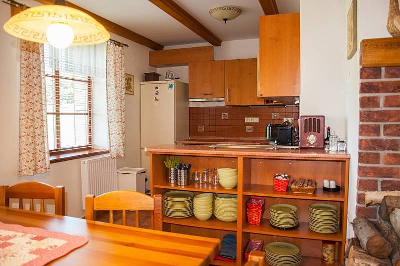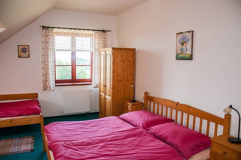 Nová prostorná polovina roubené chalupy se samostatným vchodem je situovaná na polosamotě nedaleko lesa mezi pastvinami a loukami. Na přilehlé farmě chovají majitelé koně, poníky, osly i jiná zvířata. Ubytování je vhodné i pro rodiny s dětmi, které jistě ocení, že mohou zvířata pozorovat, hrát si s nimi a třeba i se na nich povozit. Menší část chalupy obývá příležitostně paní majitelka, která se stará o případné vytápění a další služby požadované klienty.
